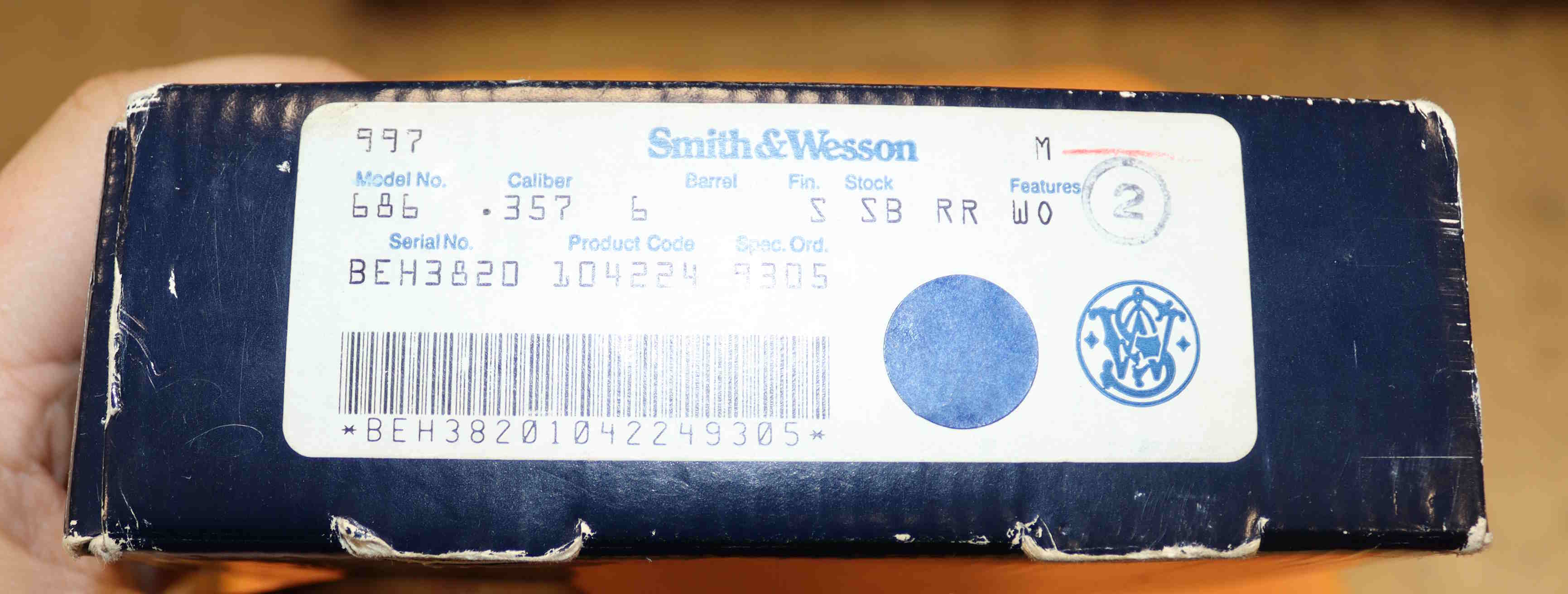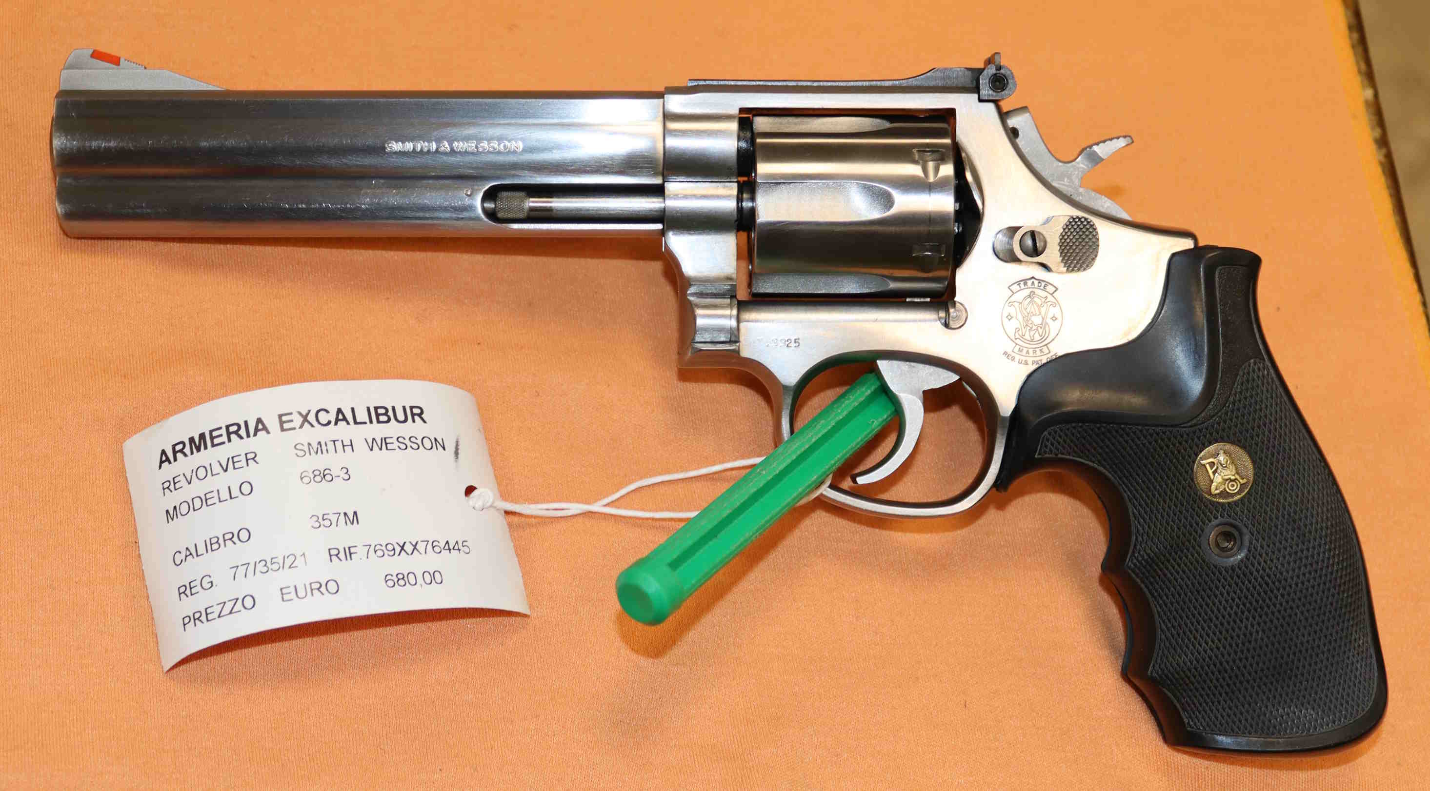 Revolver Smith & Wesson modello 686 in calibro 357M classificato sportivo in buonissime condizioni. Eventuali aloni o macchie che potete vedere nelle foto sono residui olio protezione o riflessi del flash.
