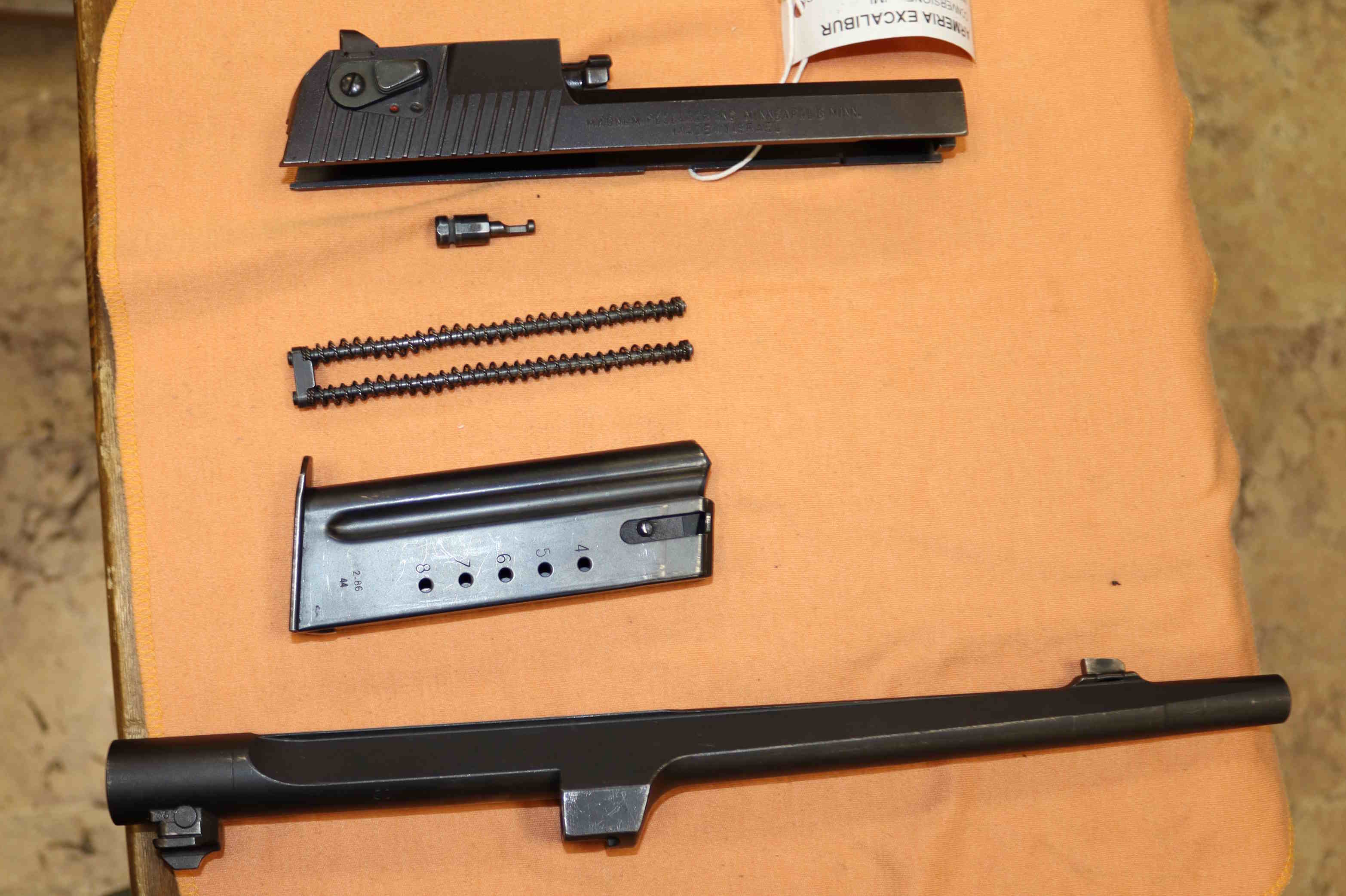 Conversione IMI Desert Eagle cal. 44 Magnum , canna da 10 pollici. La conversione non fa cumulo in denuncia. Eventuali aloni o macchie che potete vedere nelle foto sono residui olio e grasso di protezione o riflessi del flash.