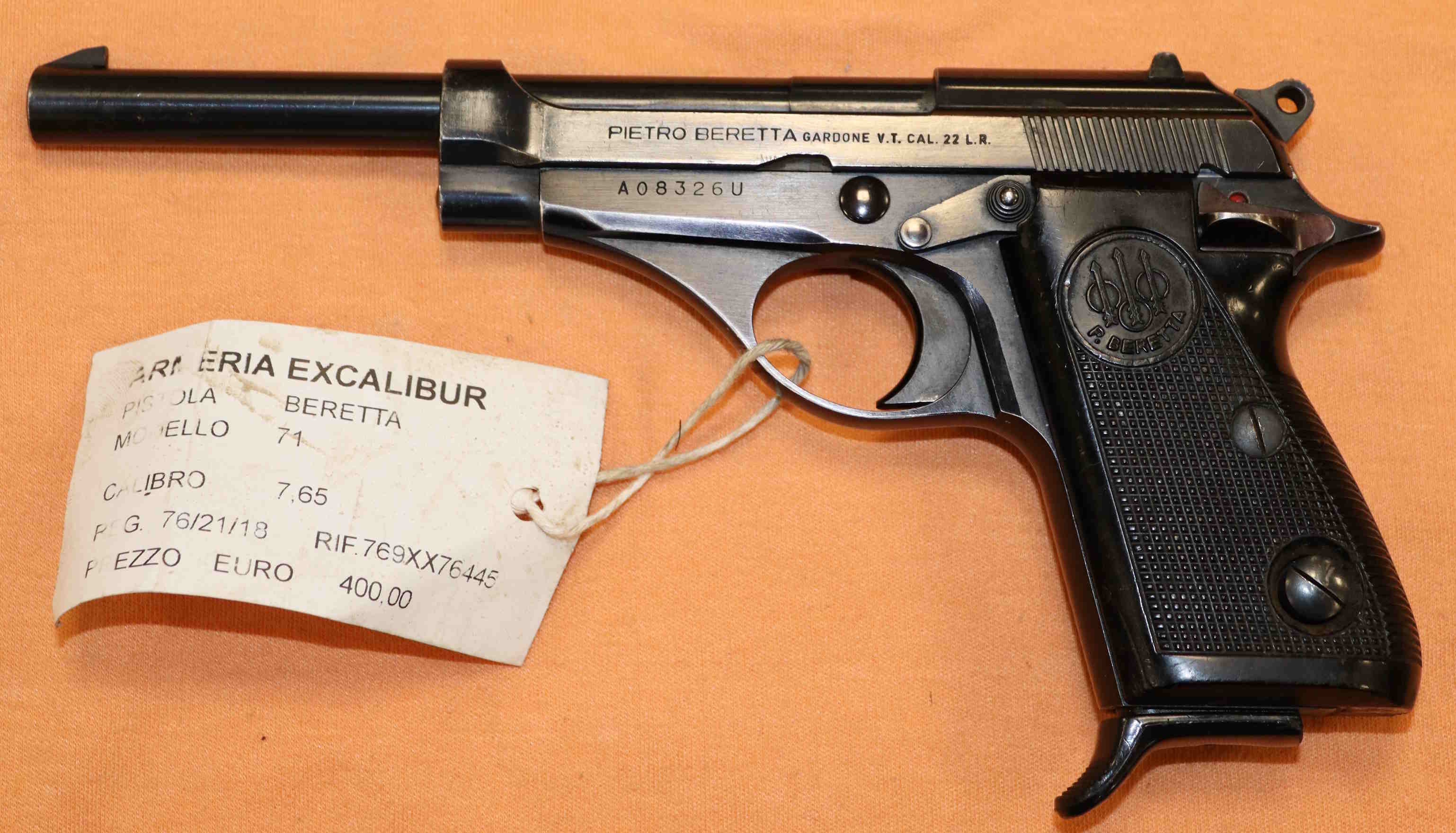 Pistola Beretta mod. 71 in calibro 22LR in buone condizioni. Eventuali aloni o macchie che potete vedere nelle foto sono residui olio e grasso di protezione o riflessi del flash.