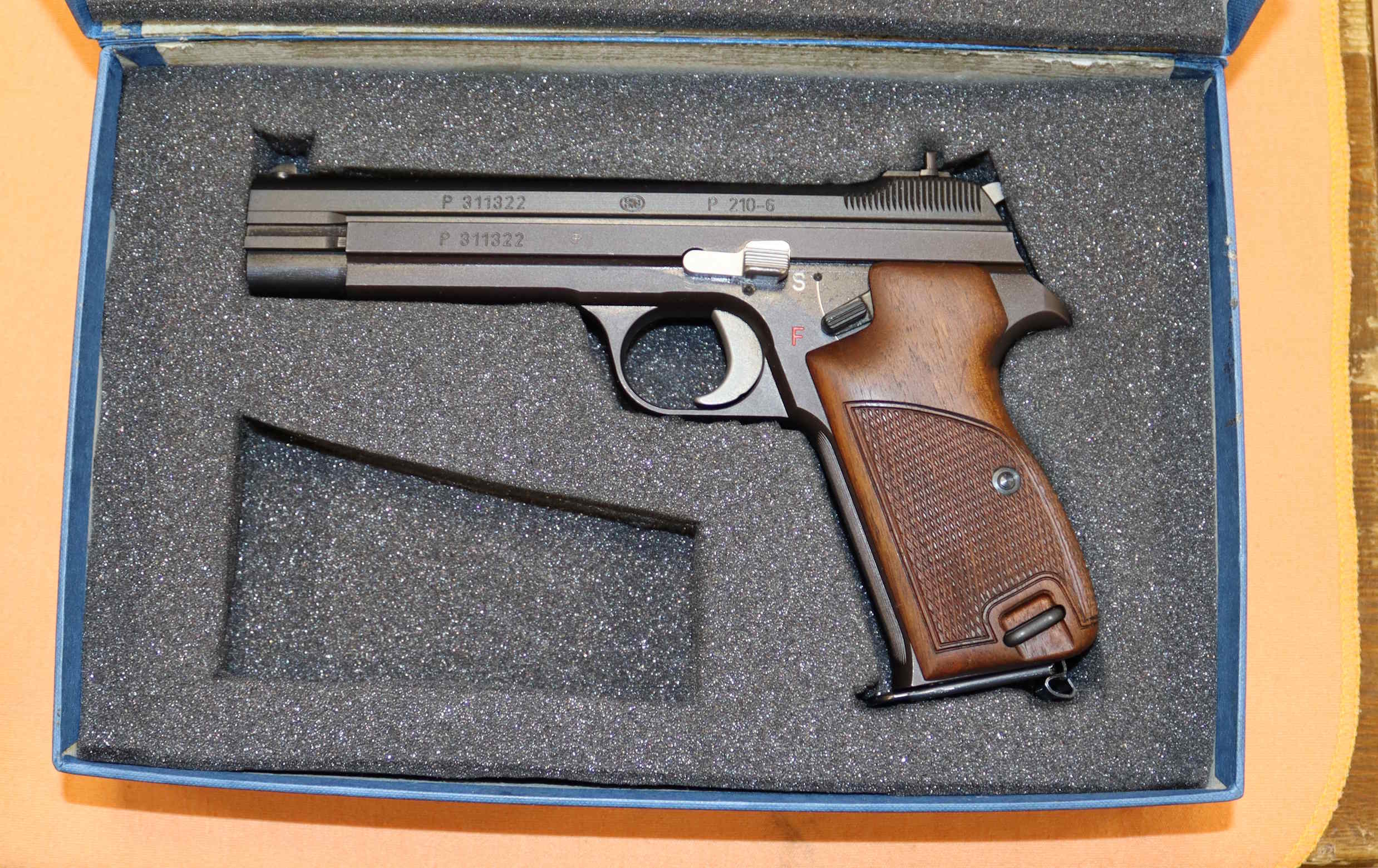 Pistola Sig 210-6 in calibro 9X21 (NATA IN 9X21) , completa di scatola e manuale. Arma solo provata praticamente come nuova. Eventuali aloni o macchie che potete vedere nelle foto sono residui olio e grasso di protezione o riflessi del flash.