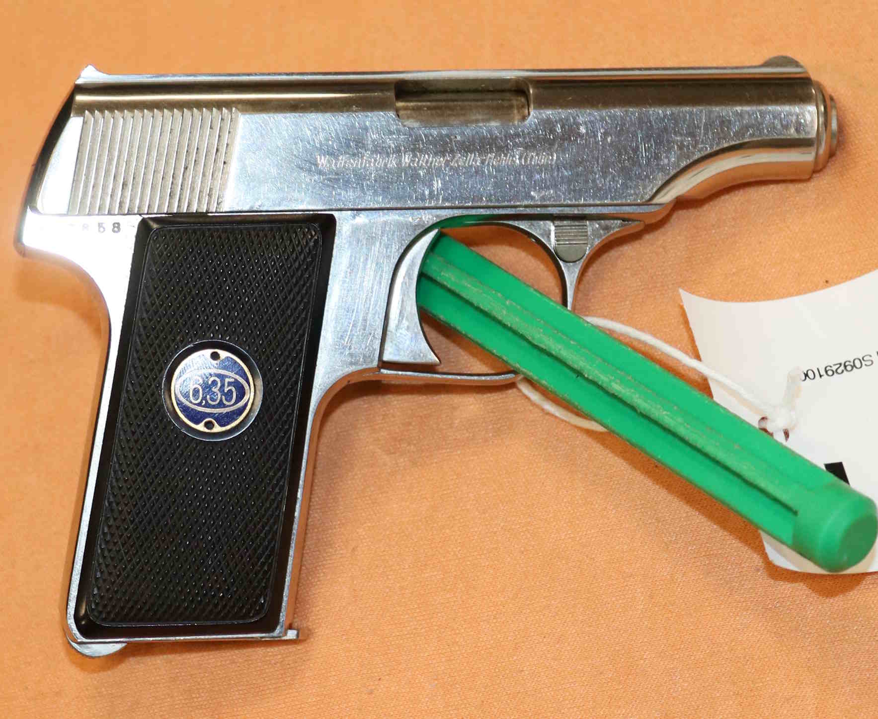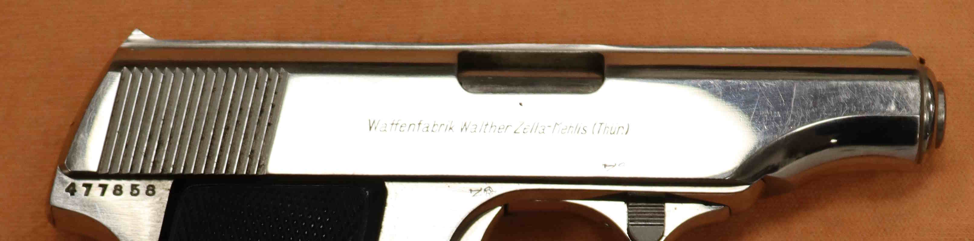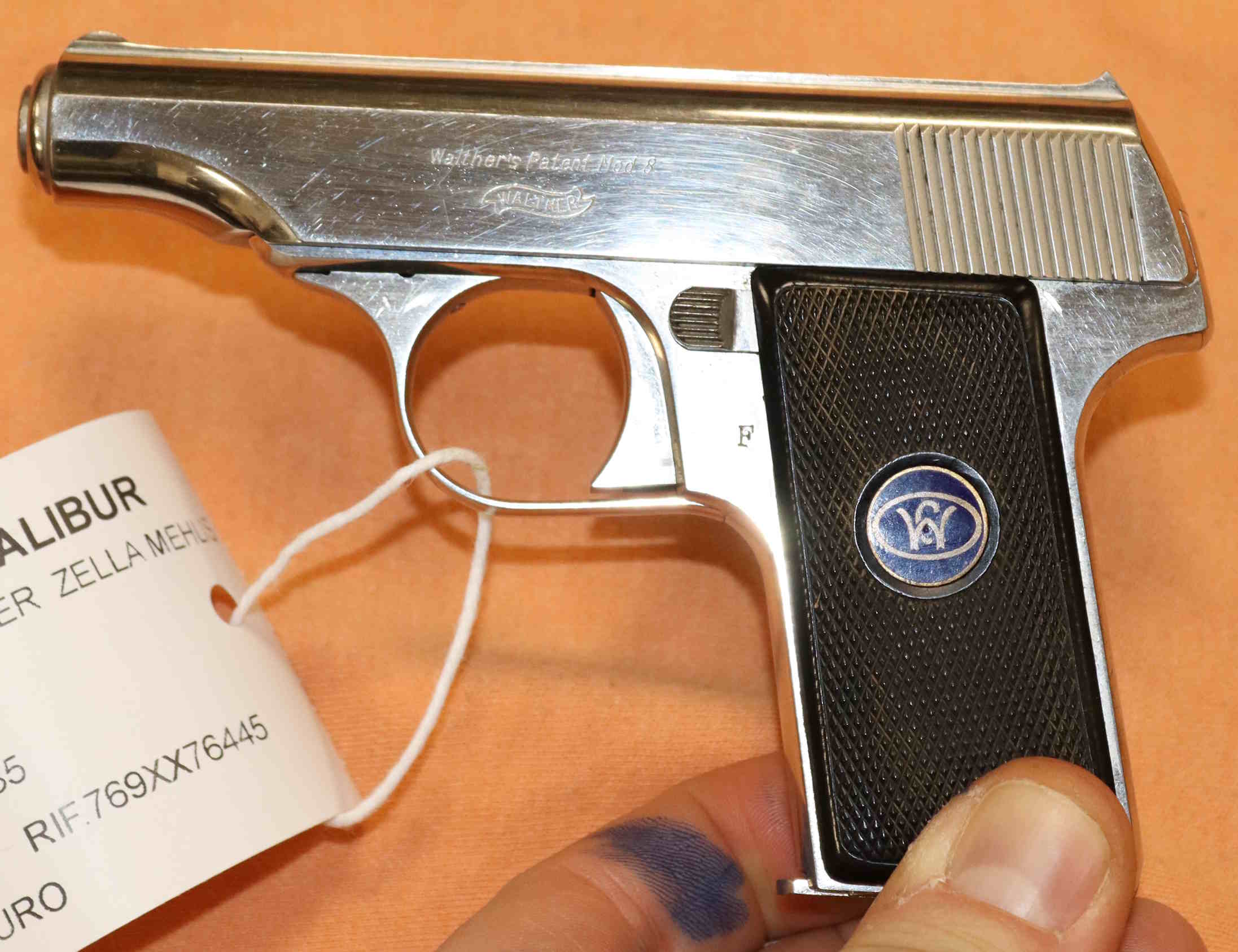 RARA Pistola Walther-Zella Mehlis 8 nickelata in calibro 6,35 come da foto . Eventuali aloni o macchie che potete vedere nelle foto sono residui olio e grasso di protezione o riflessi del flash.Possibilità di spedizione tramite armerie (50,00 euro---80,00 euro isole).