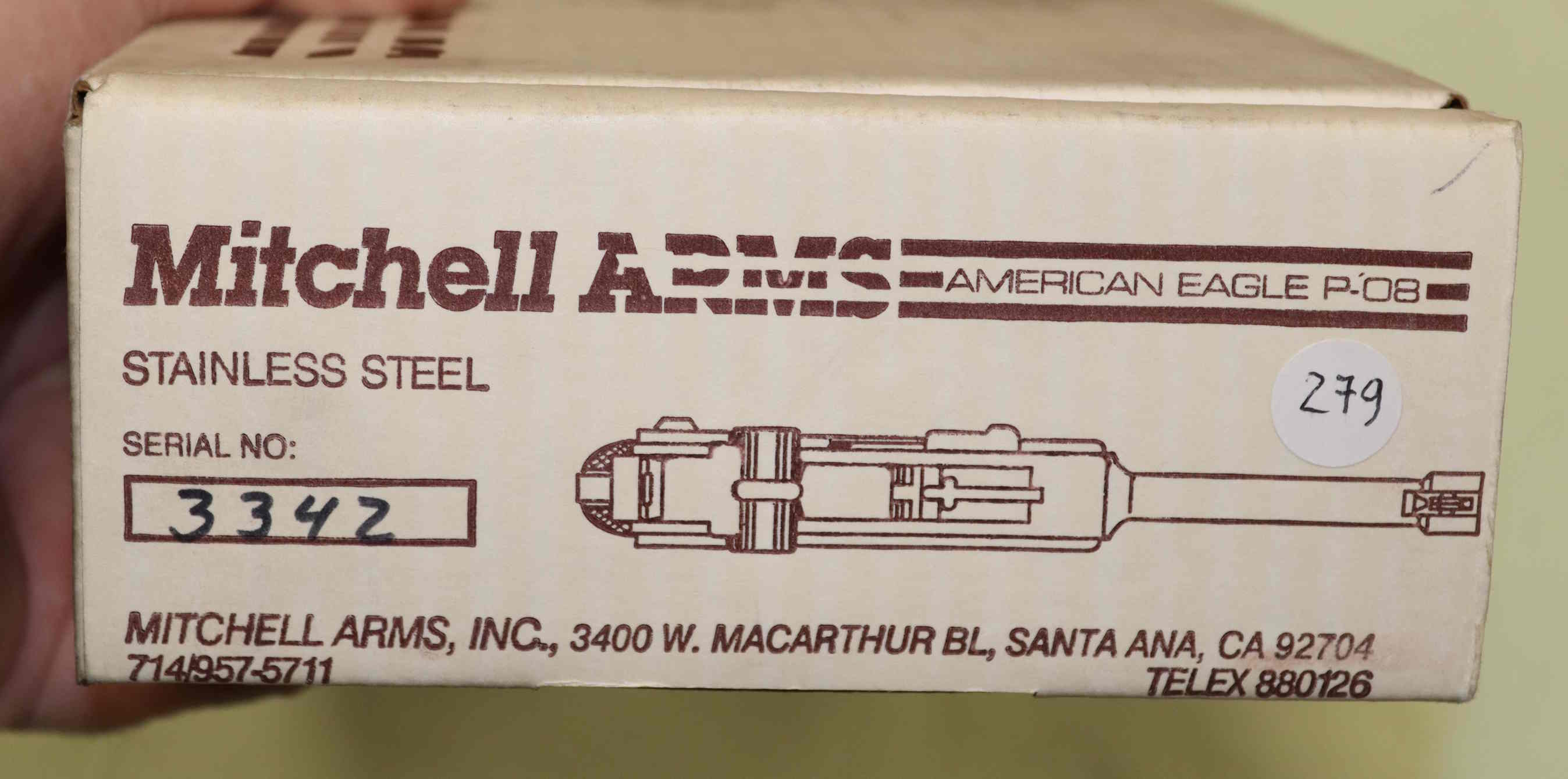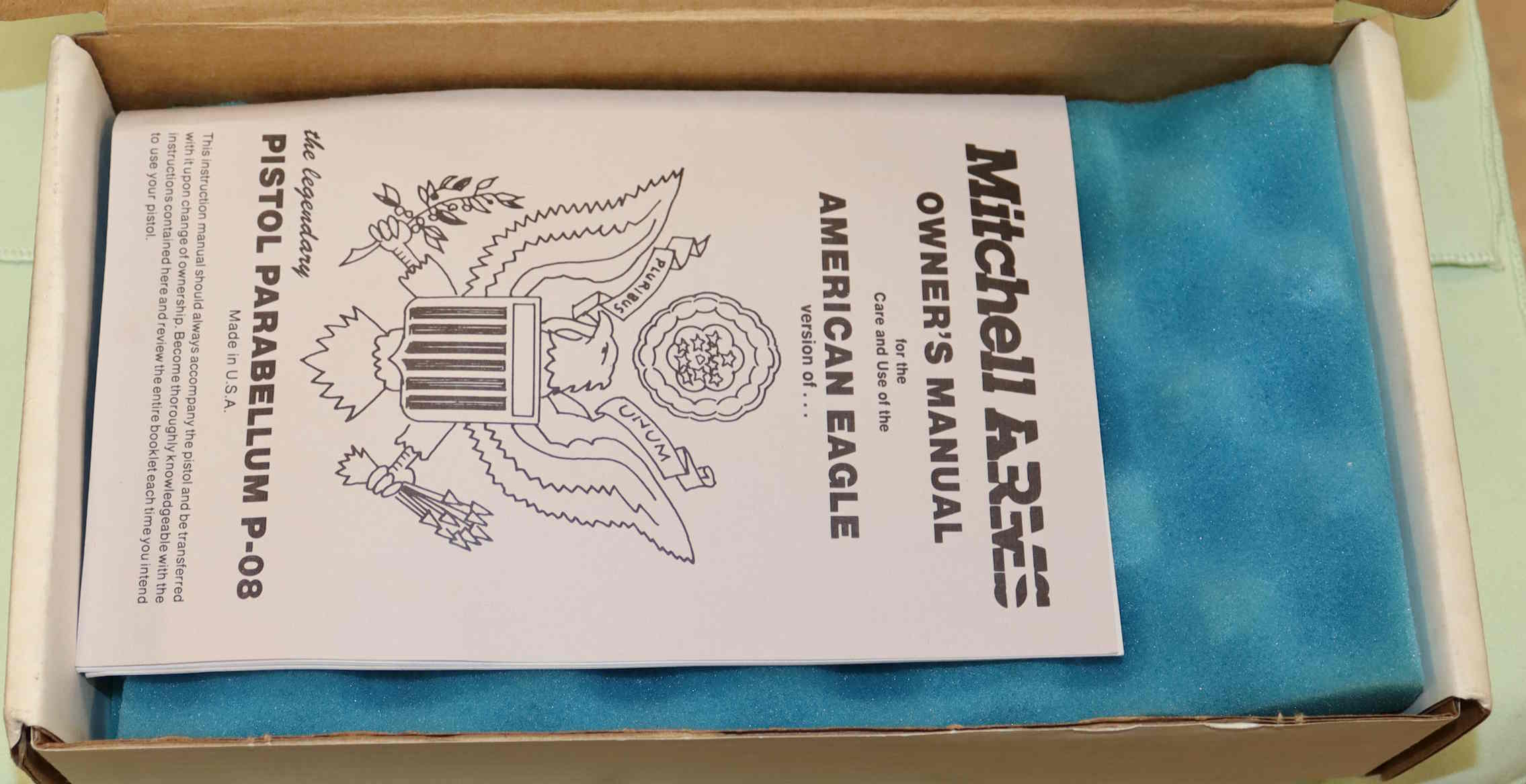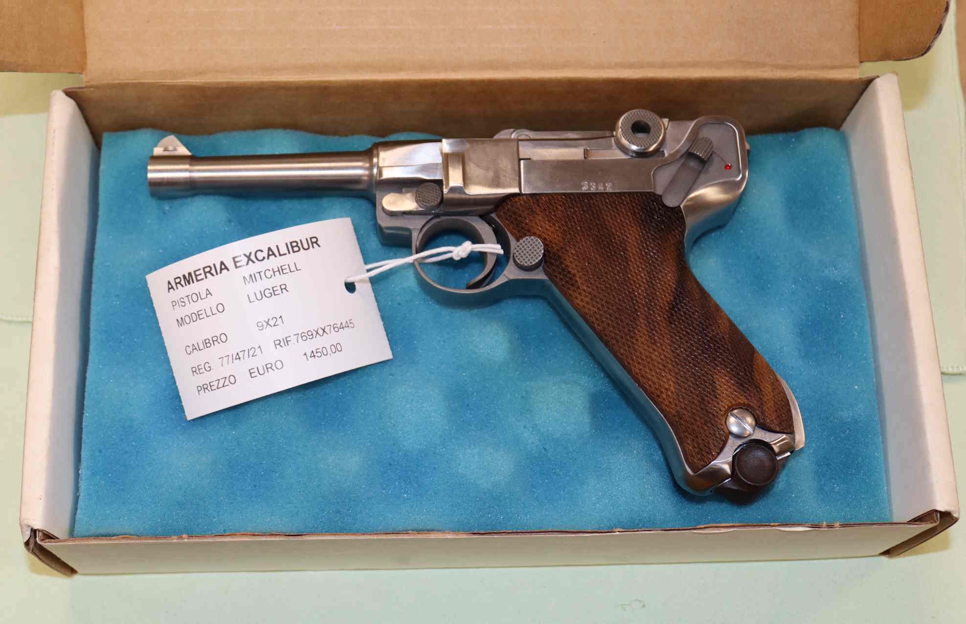 Fascinosa pistola Luger Mitchell American Arms P08 in calibro 9X21 arma nuova proveniente da collezione, completa di scatola e manuale. Eventuali aloni o macchie che potete vedere nelle foto sono residui olio e grasso di protezione o riflessi del flash.